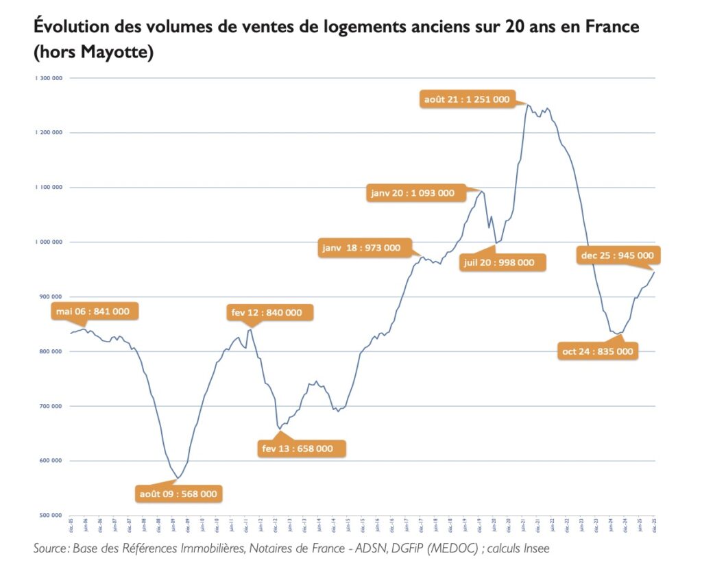 Selon la Note de conjoncture immobilière n°70 des Notaires de France (janvier 2026), le volume de transactions atteint 945 000 ventes sur douze mois glissants à fin décembre 2025.
